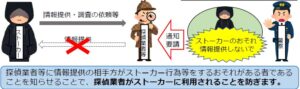 〇ストーカー規制法第6条第2項の規定による 通知等を適切に実施するため 、 警察から探偵業者に対し、 依頼者等の情報の開示を求める 場合があります 。