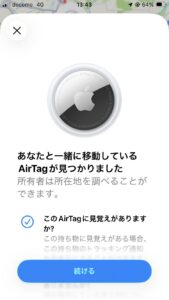 最近、「TAG GPS」や「スマートタグ」、「エアタグ」という言葉をよく耳にするようになりましたが、実際にはGPSトラッカーとは全く異なる仕組みで動作していることをご存知でしょうか?AirTagやTileなどの人気デバイスも含めて、多くの方がその機能について誤解を持たれているのが現状です。「GPSが付いていると思って購入したのに、期待していた機能が使えなかった」という声も少なくありません。また、浮気調査や浮気確認の為、夫や妻の車両、バックにスマートタグ、エアタグを忍ばせる方も多く見受けられますが、仕掛けた相手(夫・妻)の携帯に通知(下図参照)が送信されて発覚してしまいます。